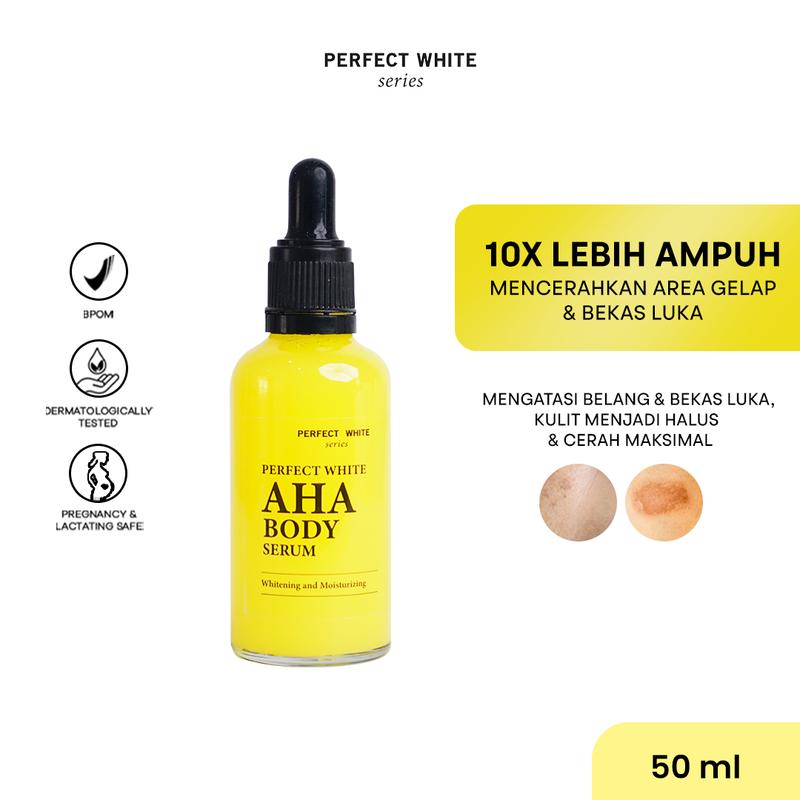 Perfect White AHA Body Serum mampu mencerahkan bagian kulit yang gelap, meratakan warna kulit, menutrisi, dan melembabkan kulit. Diformulasikan dengan 5 jenis AHA, Alpha Arbutin, Glutathione, 3-O-Ethyl Ascorbic Acid (Vitamin C), dan Niacinamide.